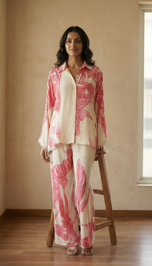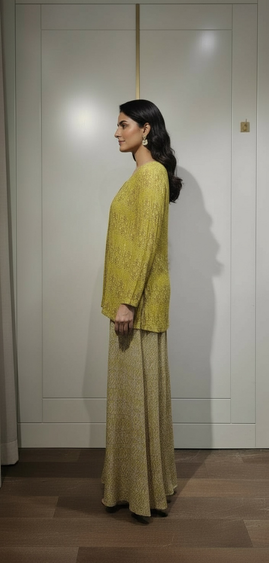 Lime Green Embroidered Kurta & Matching Printed Wide-Leg Pant Set