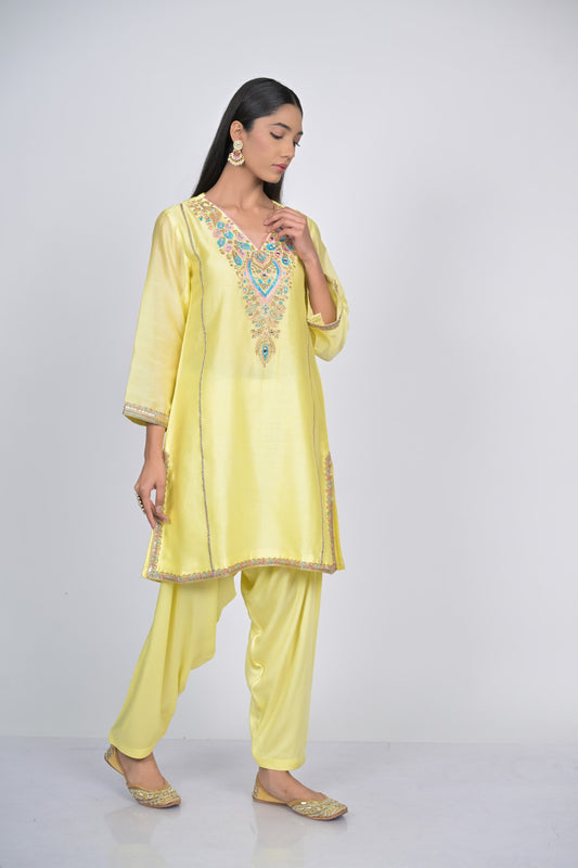 Lemon Yellow Embroidered Silk Kurta Set