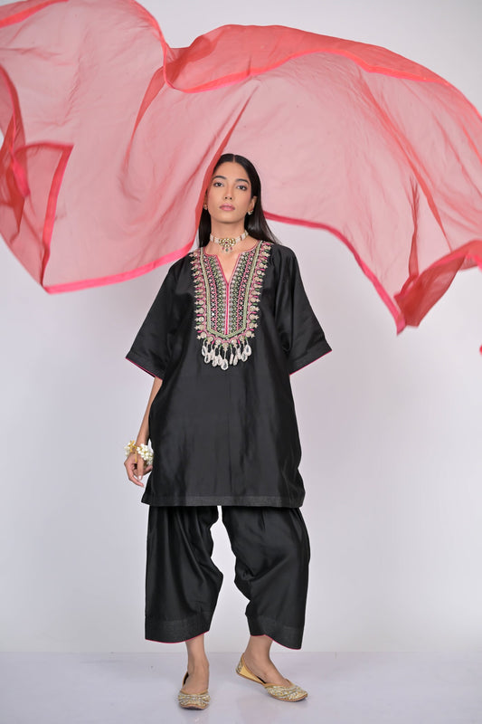 Black Embroidered Kaftan with Wide-Leg Pants Set