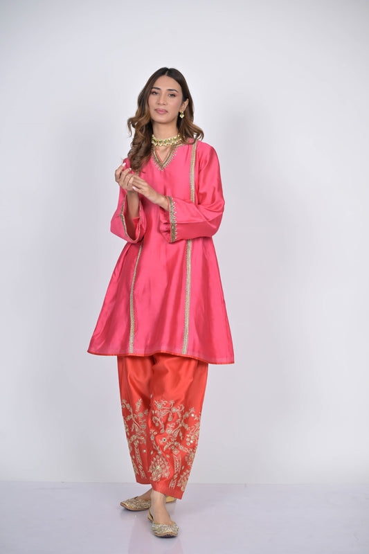 Pink and Coral Embroidered Kurta Set with Dupatta