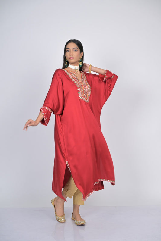 Elegant Red Embroidered Kaftan with Pants