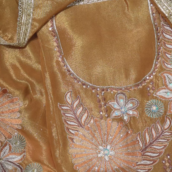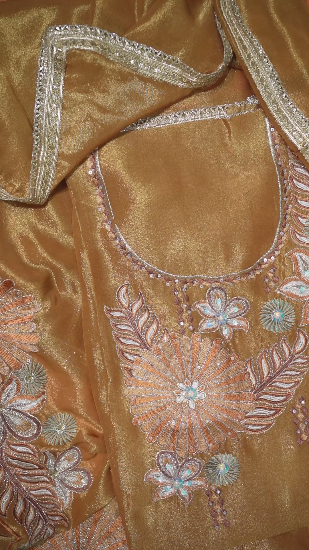 A luxurious kurta set crafted in premium feather tissue fabric for both the shirt and the dupatta, giving it a soft sheen and a beautifully fluid drape. The outfit is adorned with exquisite thread, zari, and sequin embroidery, featuring delicate floral motifs and fine artisanal detailing. The pastel highlights and metallic threads add a festive radiance, making it a perfect choice for weddings, celebrations, and elegant day occasions.