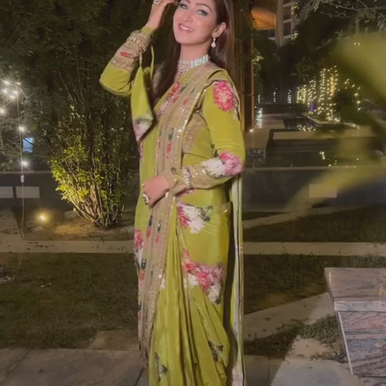 A perfect blend of elegance and festive charm, this olive green designer saree features a rich floral print beautifully complemented by intricate embellished borders. The delicate detailing along the pallu and sleeves adds a refined touch of glamour, while the smooth, flowy fabric enhances grace with every drape. Ideal for festive celebrations, wedding functions, and evening gatherings, this saree brings together timeless tradition with contemporary sophistication.