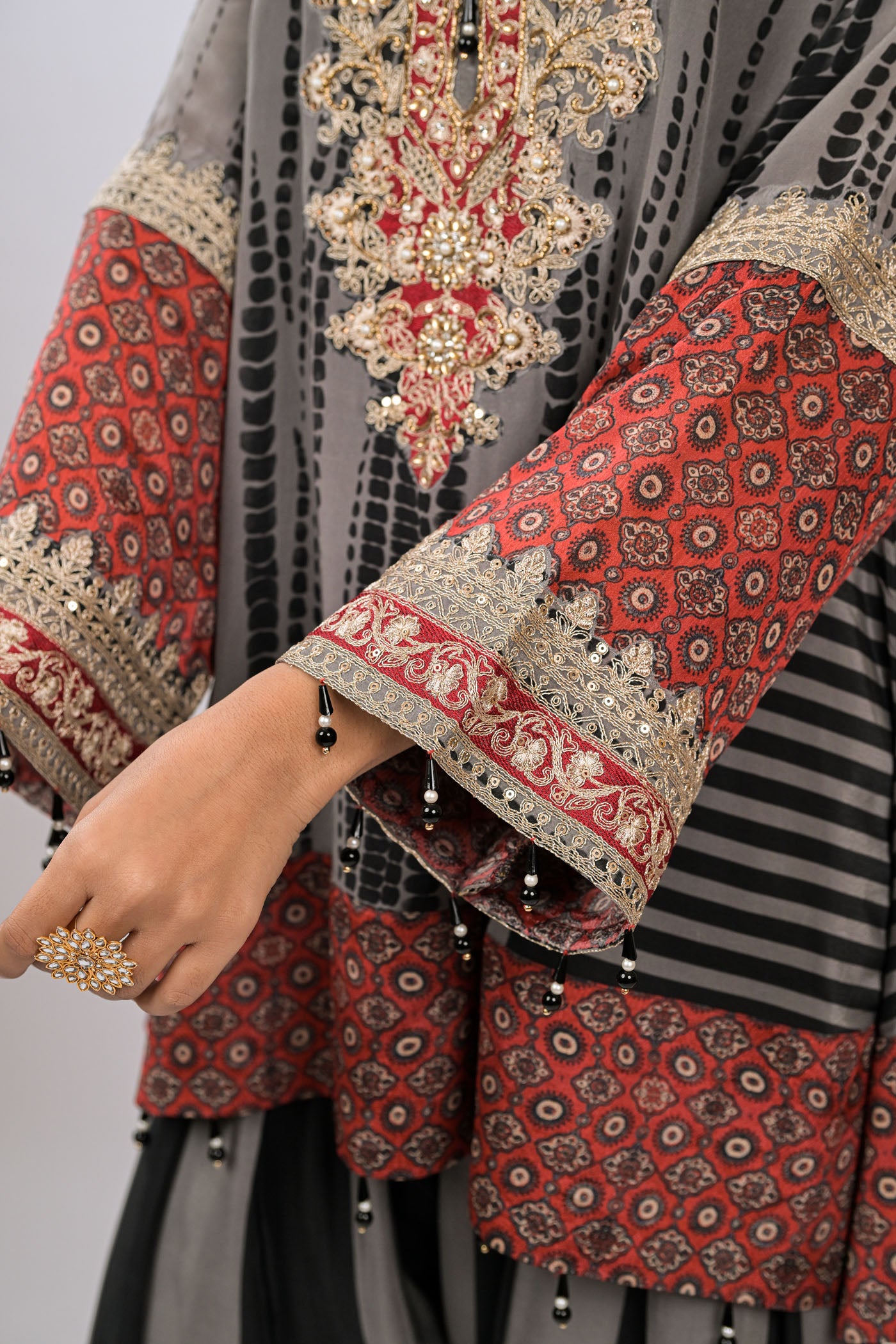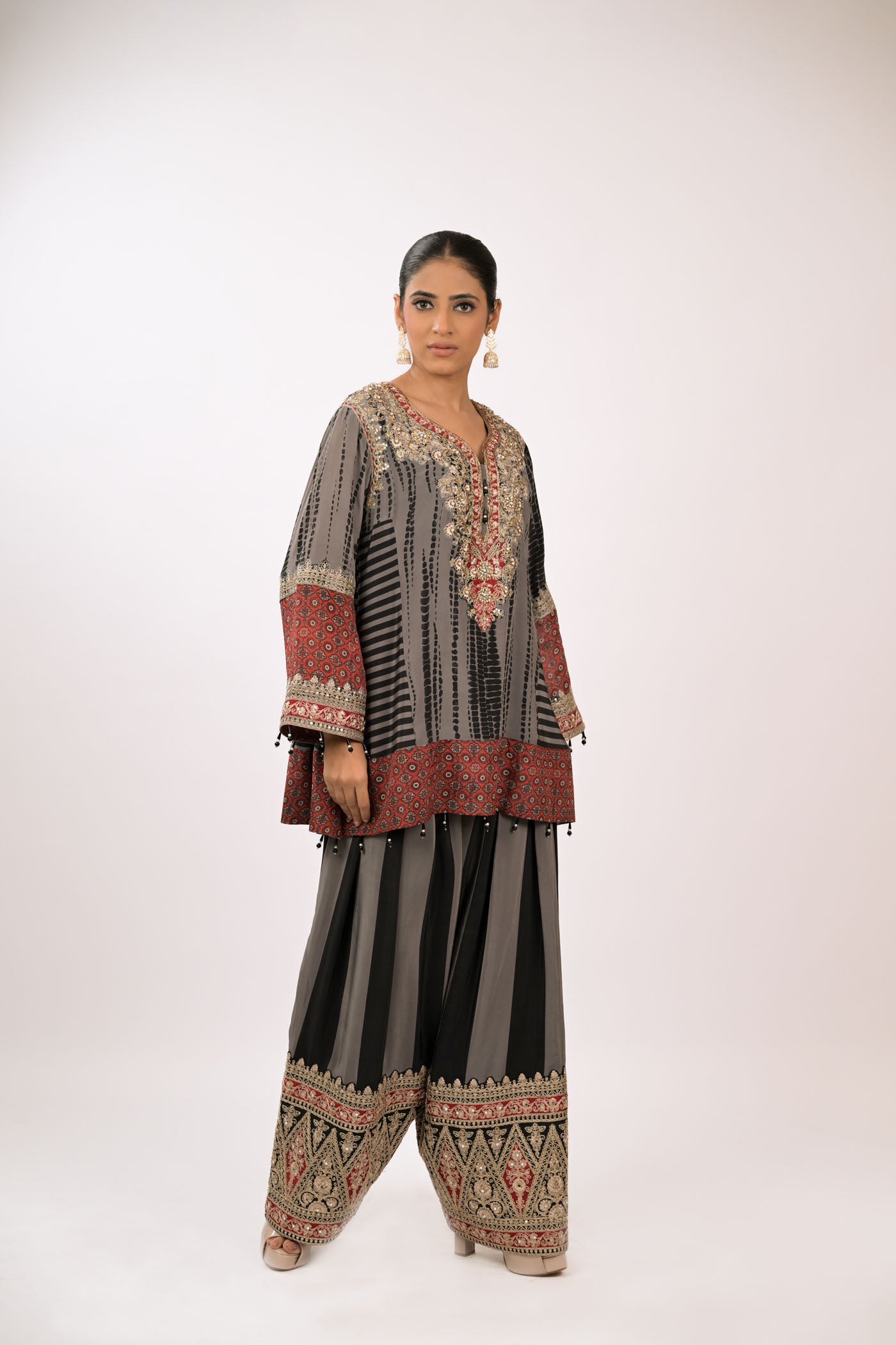 This refined kurta set features a richly embroidered straight-cut kurta paired with coordinated straight-fit pants and a contrasting dupatta. The kurta showcases intricate geometric and floral embroidery in antique gold and deep garnet tones, accentuated by detailed borders at the neckline, sleeves, and hem. The sheer black dupatta, finished with embroidered edging, adds depth and elegance to the ensemble. Ideal for festive evenings, formal gatherings, and traditional celebrations, this set balances ornate detailing with a modern colour palette.