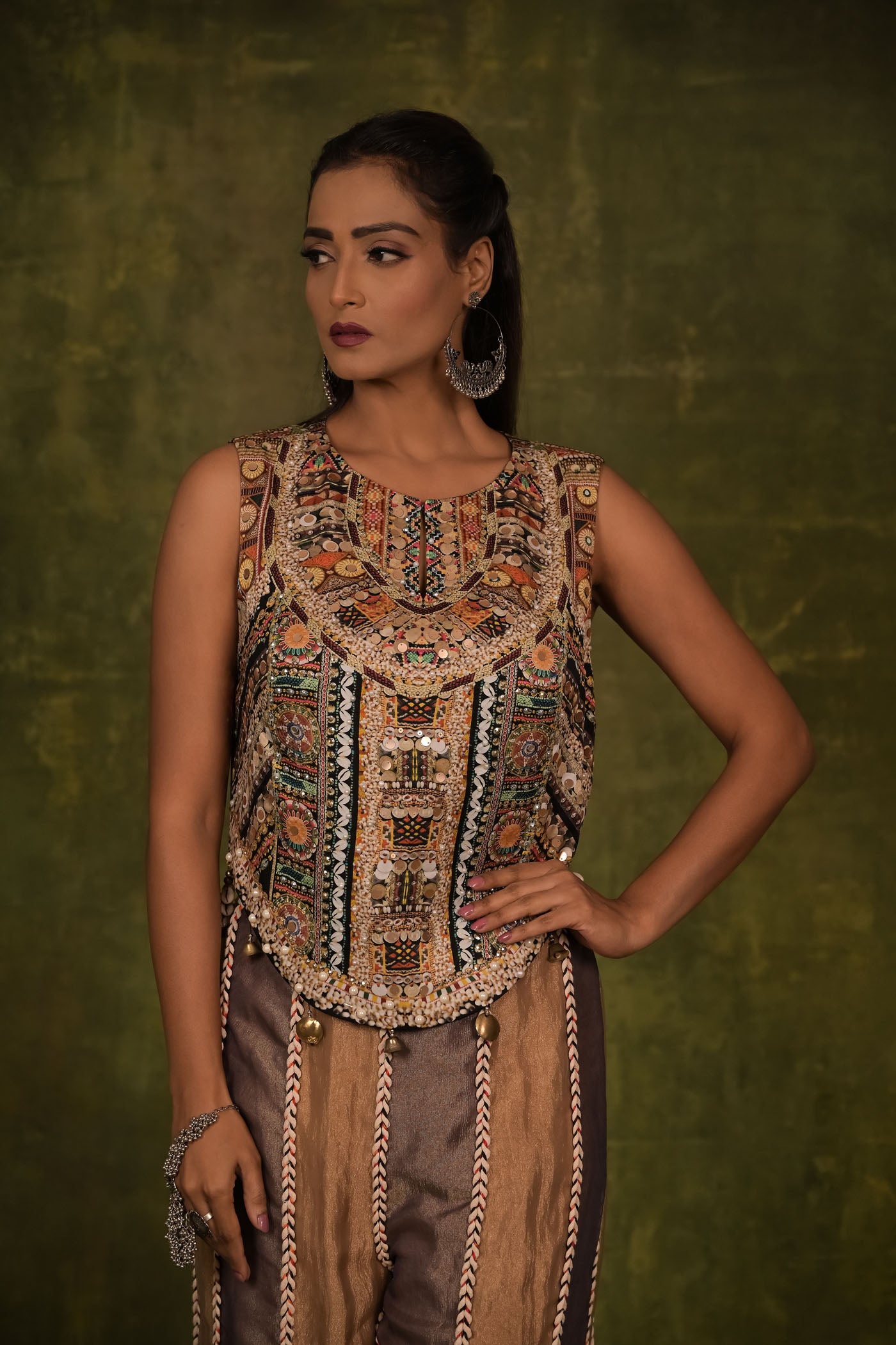 The top features dense hand embroidery using beads, sequins and coloured threads creating detailed ethnic patterns for a regal touch. Beaded tessels add movements to the hem, while the palazzo include embroidered vertical borders that enhances the garment's elegance.