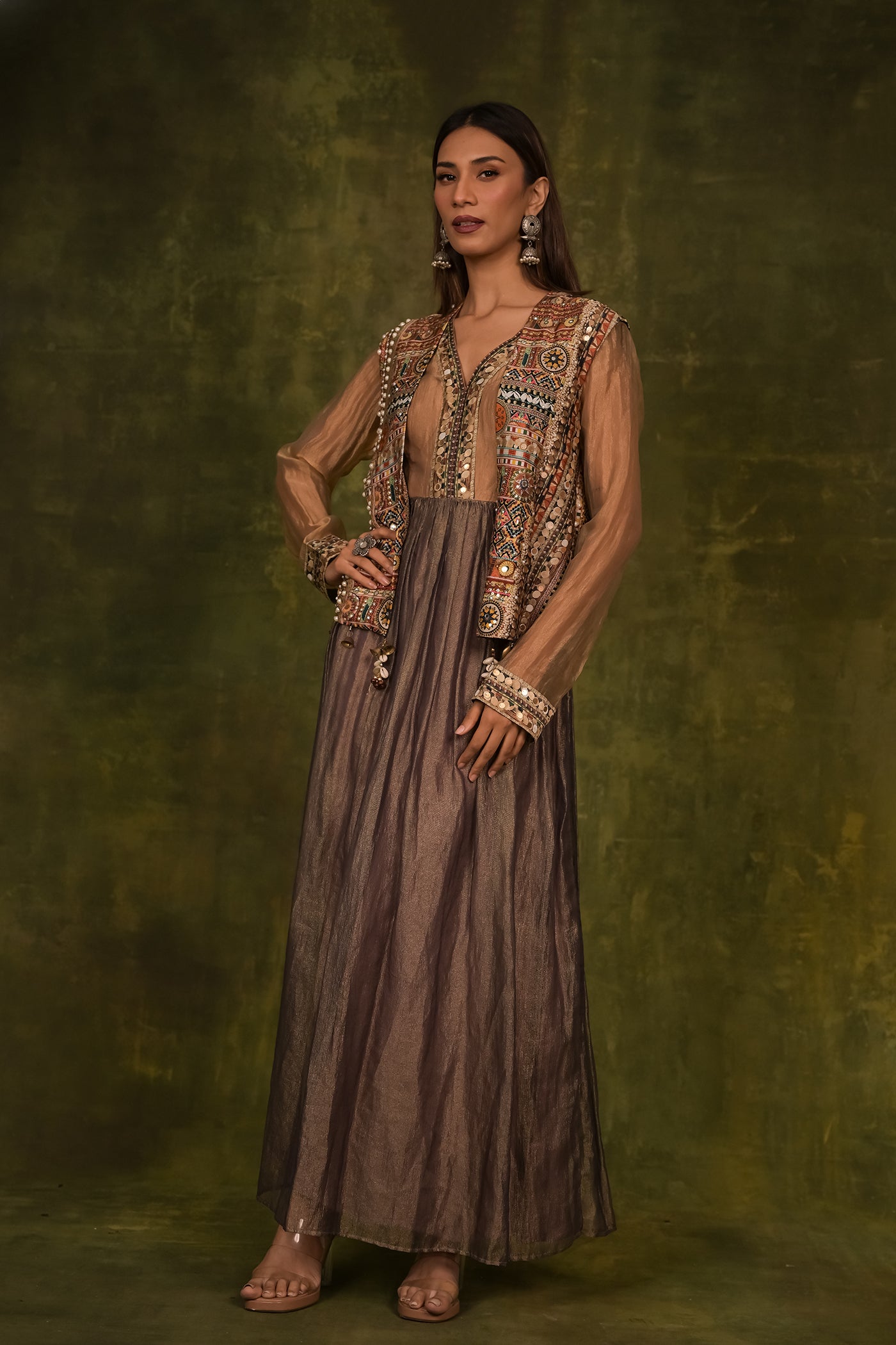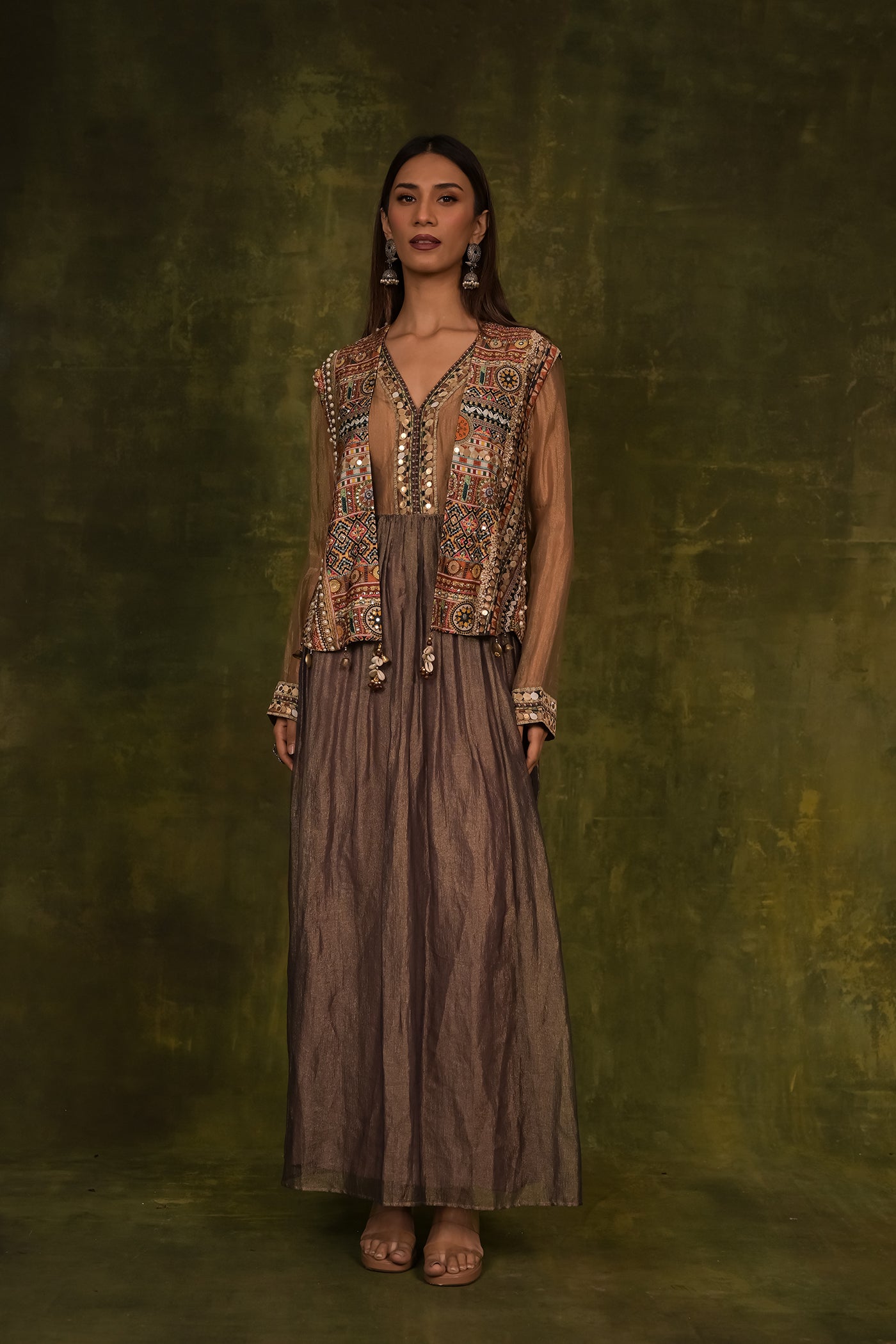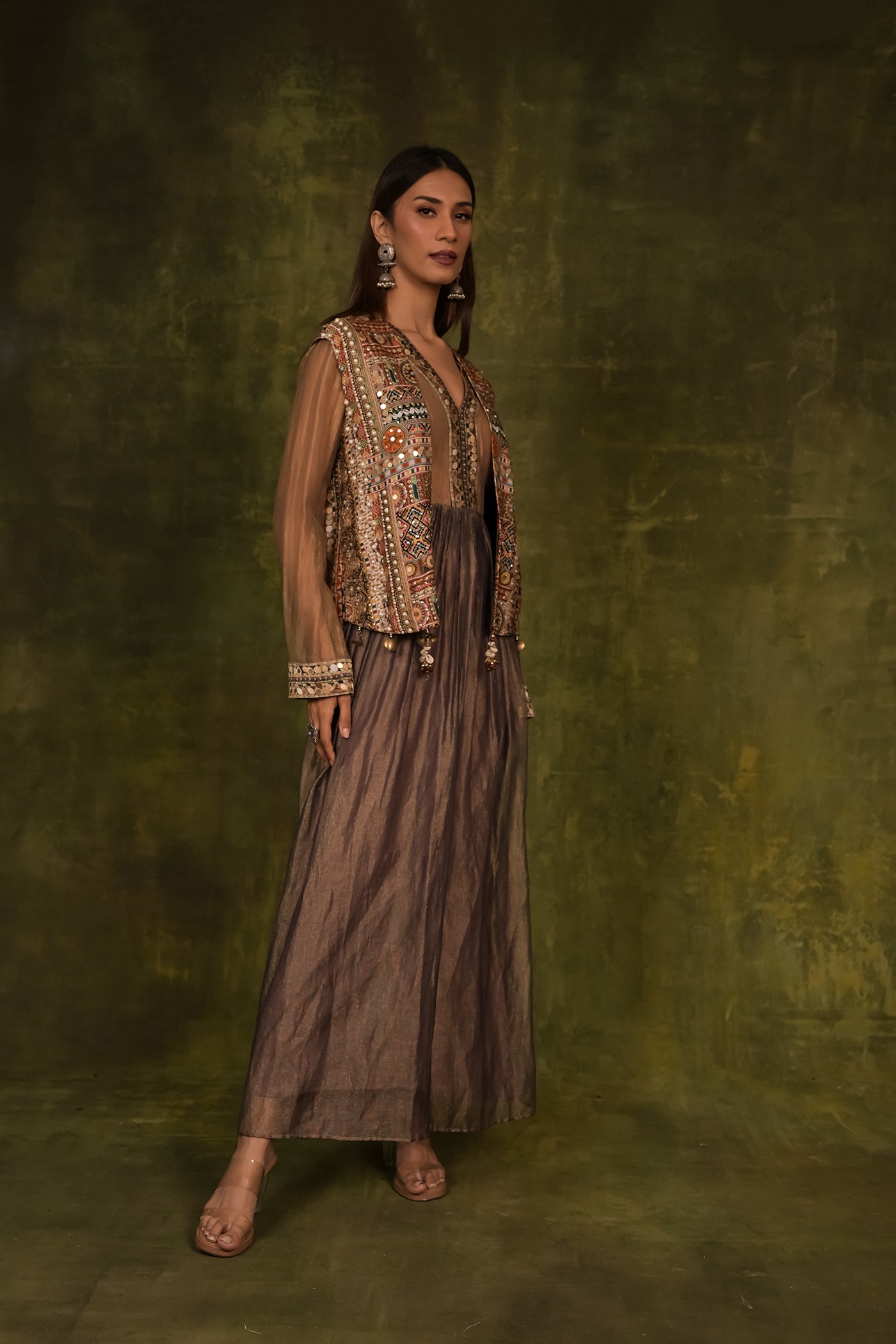 This dress is beautiful party wear crop top with kaftan chokha, which is shiny brown outfit with wide sleeves. It has bright, colorful embroidery and mirror work around the nacklines and oh the cluffs. There are amazing tassels hanging from the front, and the bottom layer is a shiny golden fabric that shows slightly. This dress is good for festive or special occasions.