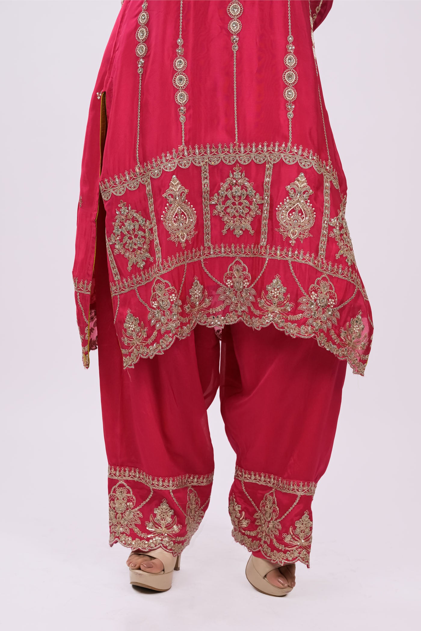 The Gulbahaar Kurta Set is a beautiful celebration of colour and craftsmanship. The kurta features intricate thread and zari embroidery accentuated with delicate motifs along the neckline, sleeves, and hem, creating a rich festive appeal. Paired with coordinated straight-fit pants detailed with embroidered borders, the ensemble is completed with a contrasting dupatta finished with fine embroidery and a soft scalloped edge. This striking combination makes it perfect for festive gatherings, weddings, and joyful celebrations.
