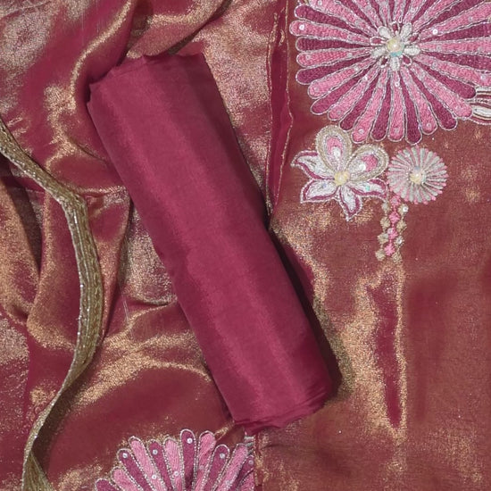 A rich and festive kurta set crafted from premium feather tissue fabric for both the shirt and dupatta, offering a soft sheen and luxurious drape. The outfit features exquisite thread, zari, and sequin embroidery with beautifully detailed floral motifs in shades of pink and pastel tones. The shimmering surface paired with delicate handwork makes this ensemble a standout choice for weddings, festive evenings, and elegant celebrations.