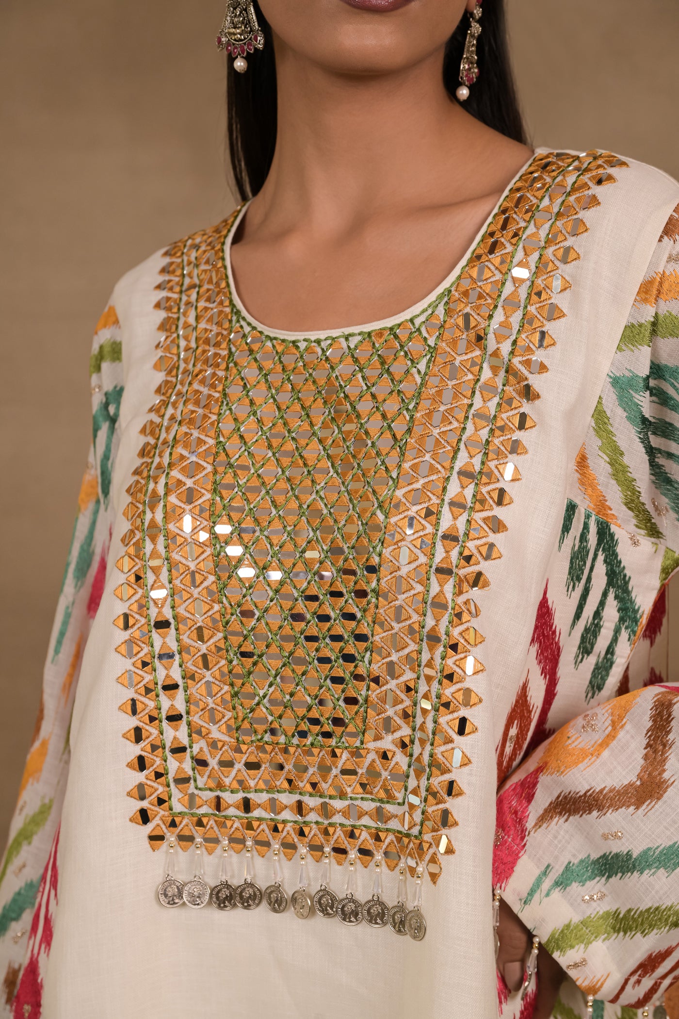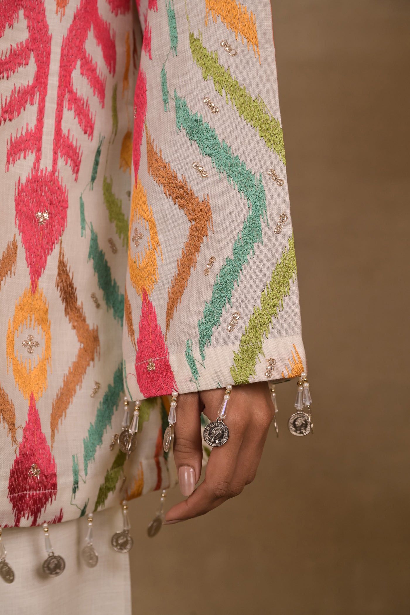 Color - Ivory White with Multicolour Ikat-Inspired Sleeve Accents