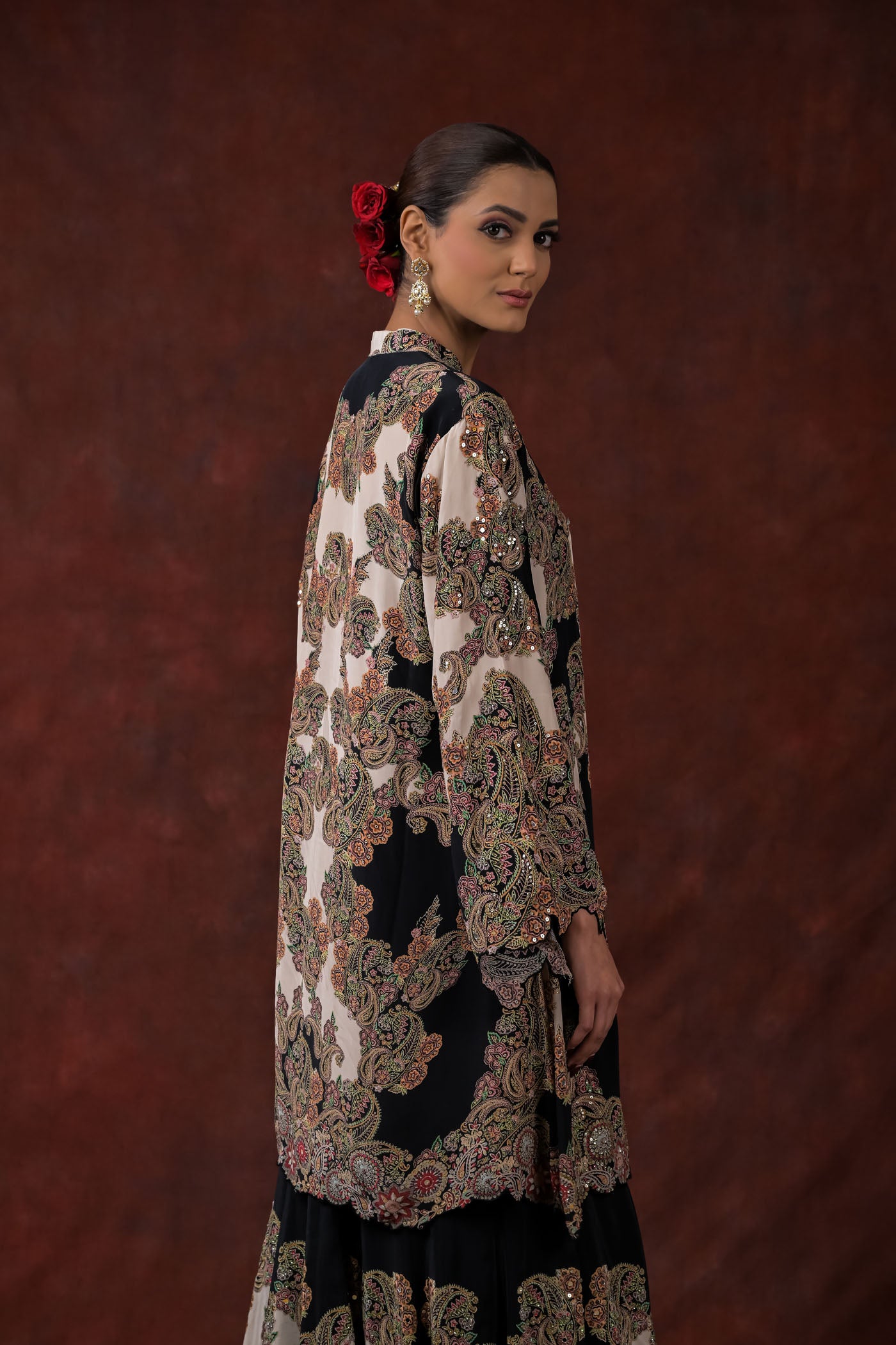 This statement kurta set features an embroidered inner kurta paired with a long, open-front jacket and coordinated flared pants. The ensemble is adorned with intricate floral and paisley embroidery in antique gold and muted pastel tones, set against a striking black and ivory base. The jacket-style overlay adds structure and dimension, while the flowing pants create balance and movement. Ideal for festive gatherings, evening celebrations, and contemporary ethnic occasions, this set reflects refined craftsmanship with a modern silhouette.