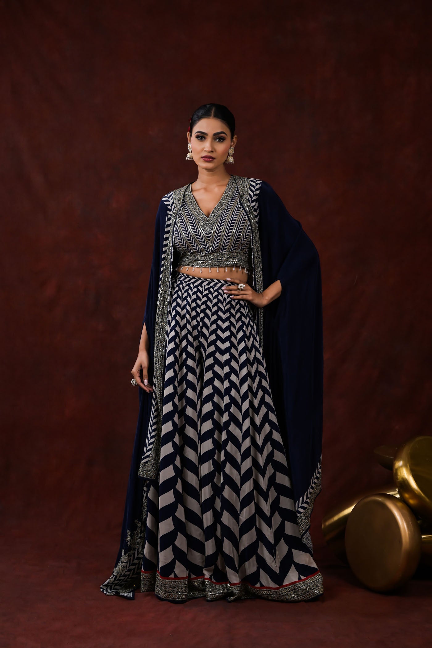 A striking three-piece ensemble designed to make a statement. The set features a richly embellished bustier adorned with intricate zari and sequin embroidery, paired with printed flare pants that create graceful movement. Completing the look is a fluid cape, finished with detailed borders that add drama and elegance. Crafted for modern festive dressing, this ensemble blends traditional artistry with a bold, contemporary silhouette—perfect for soirées, festive celebrations, and wedding festivities.