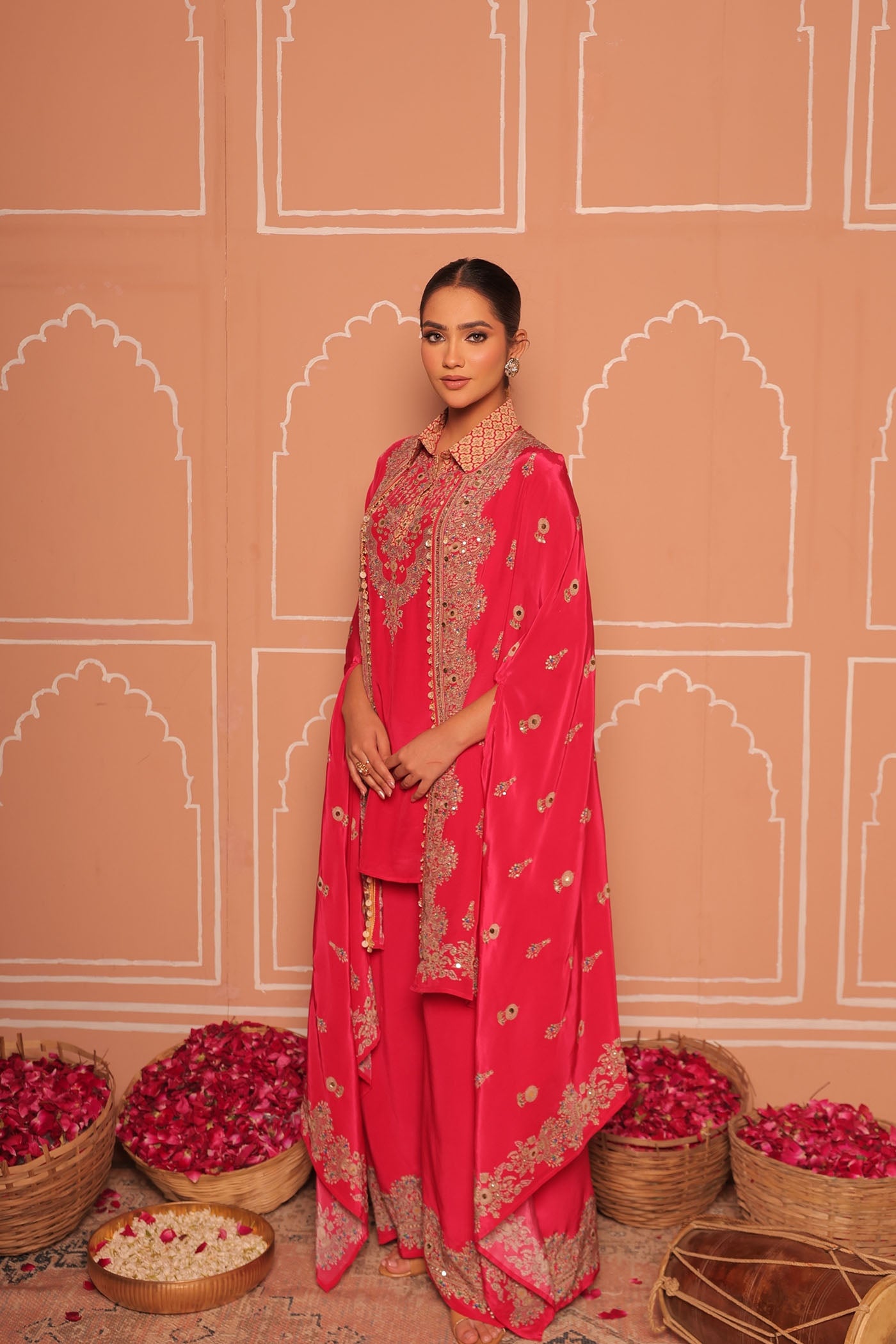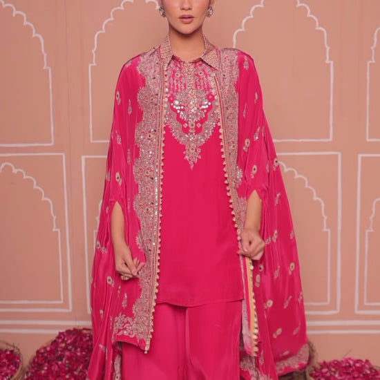 Crafted in premium soft crepe, this rani pink cape set showcases exquisite gotta work embroidery highlighted with thread, mirror, and hand-done detailing.