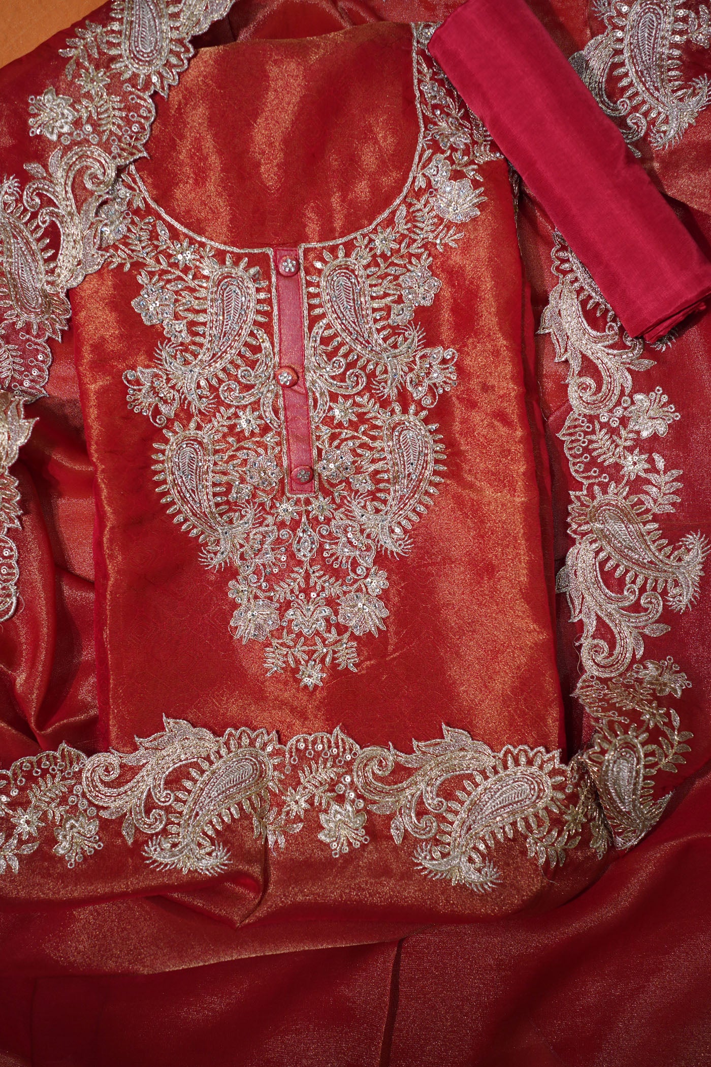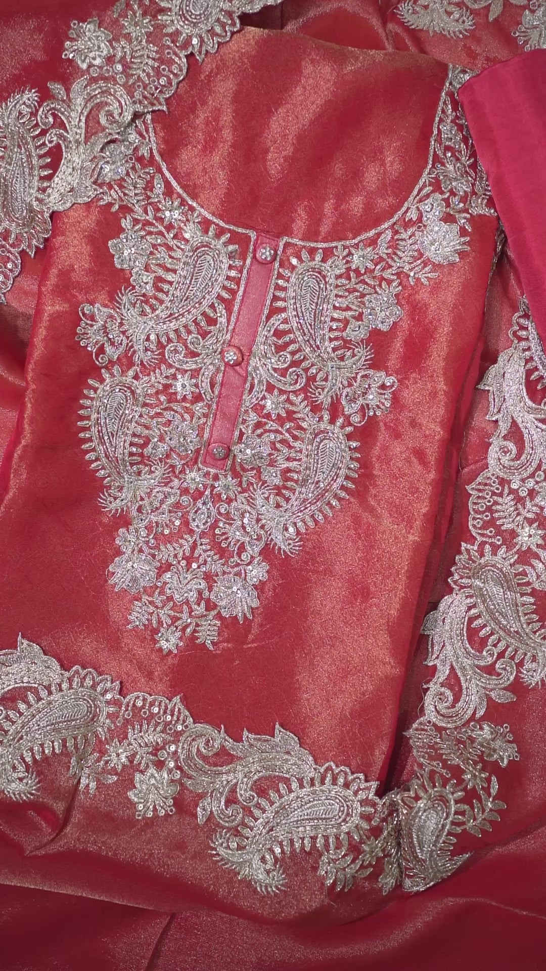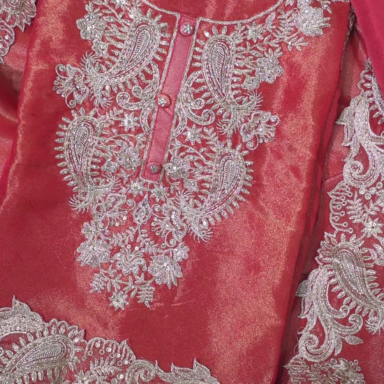 An opulent kurta set crafted in rich texture tissue silk paired with a luxurious feather tissue dupatta. The set is adorned with exquisite dori work, highlighted with intricate paisley and floral motifs embroidered in shimmering zari and sequin detailing. Each element is thoughtfully placed to create a regal, festive look perfect for weddings, receptions, and grand celebrations.