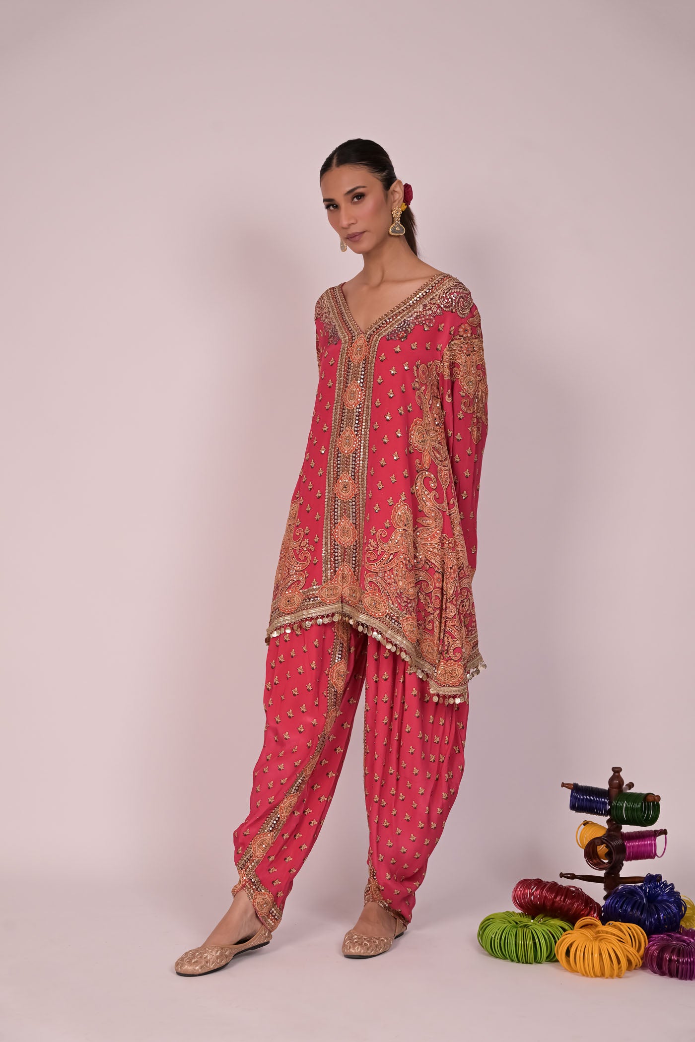 Beautiful coord set is made with the pure crepe fabric and has a digital print with intricate embroidery using swarovski, sequins,coin lase with real mirror embroidery on the aline top and the bottom covers also.