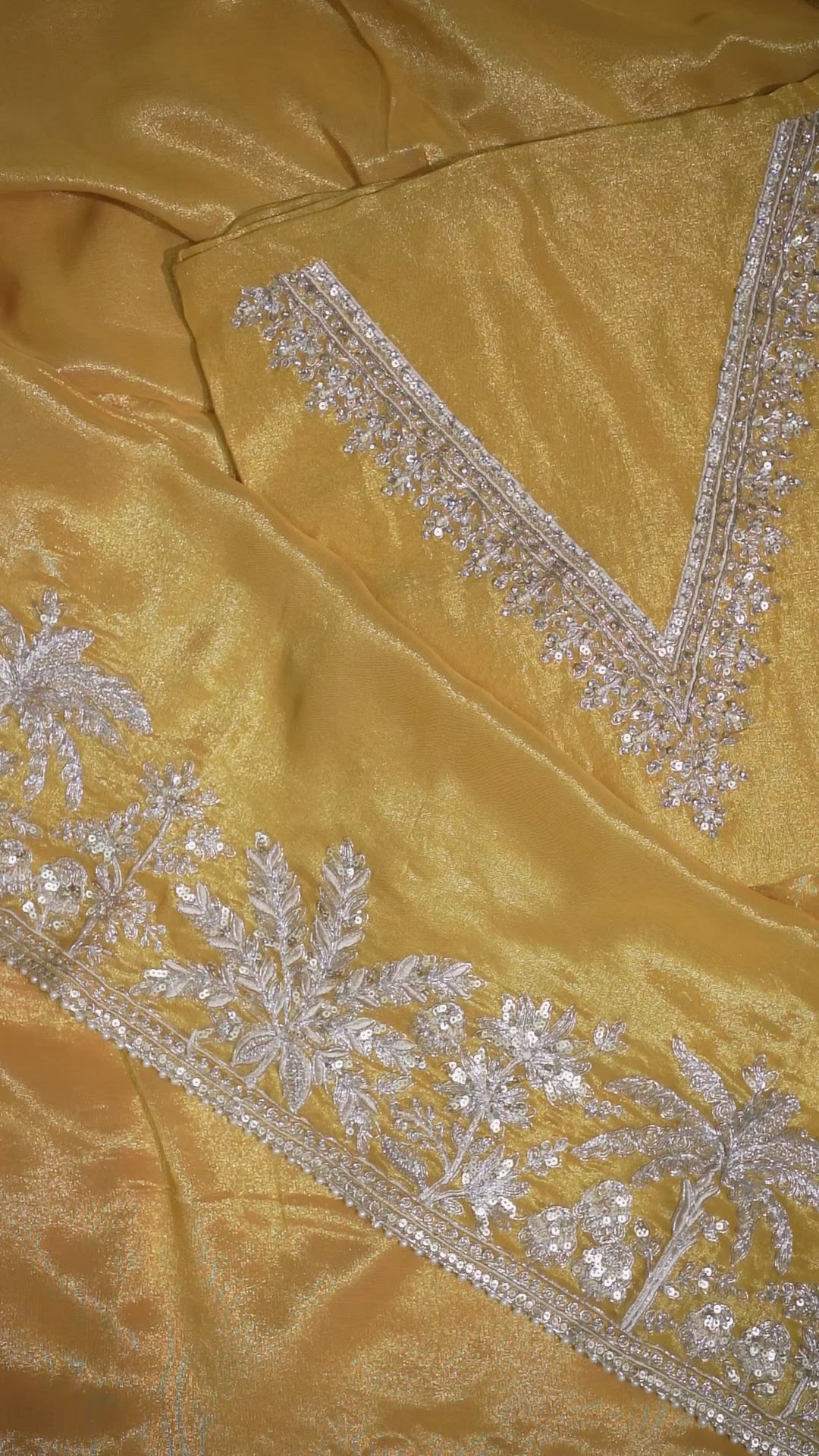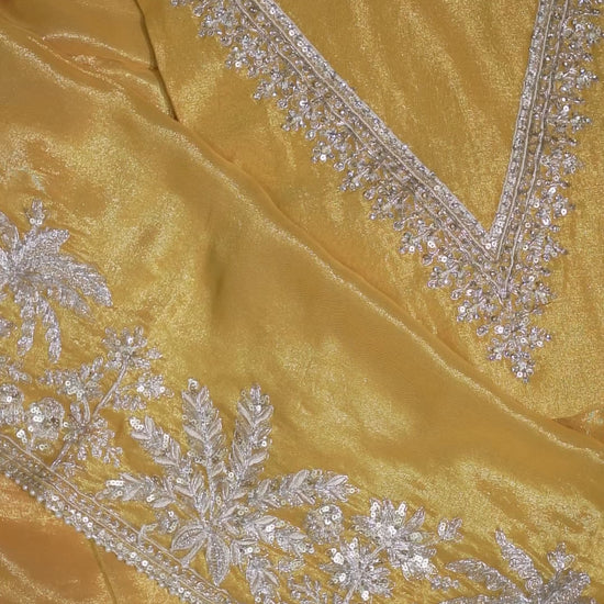 A radiant feather-tissue kurta set highlighted with delicate dori embroidery, sequins, and fine thread detailing. The lightweight fabric with a soft shimmer brings effortless festive elegance—perfect for engagements, celebrations, and refined traditional dressing.