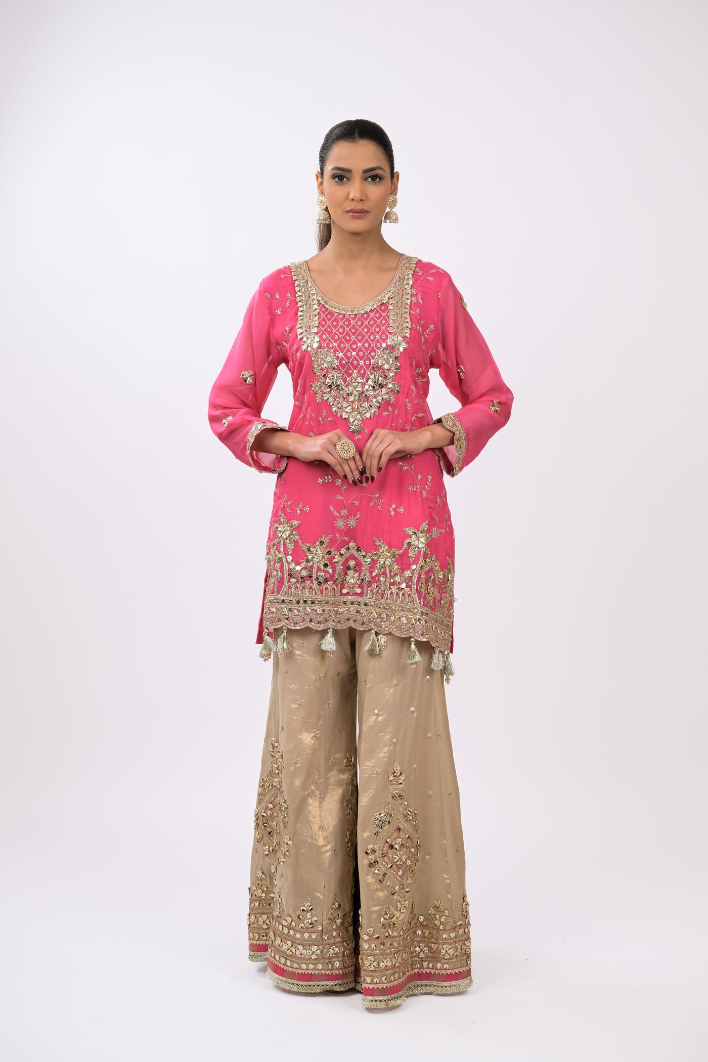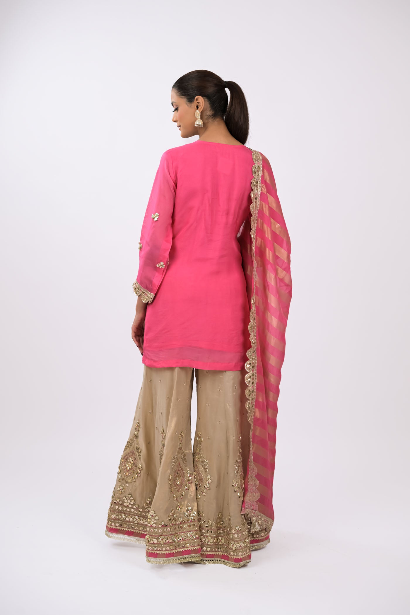 A graceful festive kurta set designed with intricate hand embellishments and delicate embroidery, this ensemble blends traditional charm with contemporary elegance. The kurta features detailed work on the yoke and sleeves, paired with beautifully embroidered palazzo pants. The look is completed with a striped, embellished dupatta that adds depth, movement, and festive richness. Perfect for weddings, festivities, and celebratory gatherings, this set is crafted to make an effortless statement.