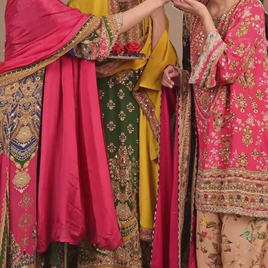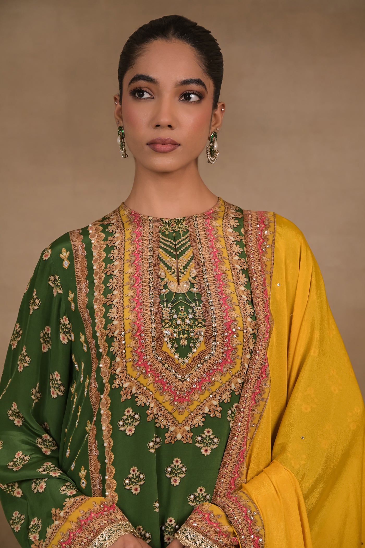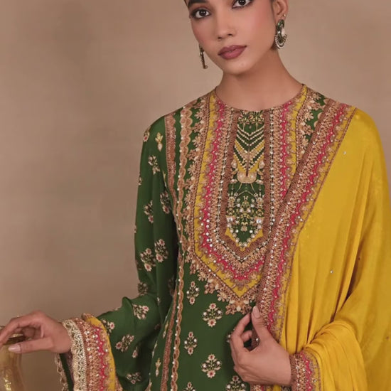 An elegant three-piece kurta set featuring a richly detailed emerald green long kurta paired with contrasting mustard pants and a coordinated dupatta. The kurta showcases intricate zari, sequin, and mirror-inspired embellishments in vertical panel detailing, creating a regal and elongating silhouette. Delicate floral motifs and an ornate border enhance the hemline and sleeves, while the mustard pants add a vibrant contrast. The matching dupatta completes the ensemble with subtle detailing, making it perfect for festive gatherings, wedding functions, and celebratory occasions.
